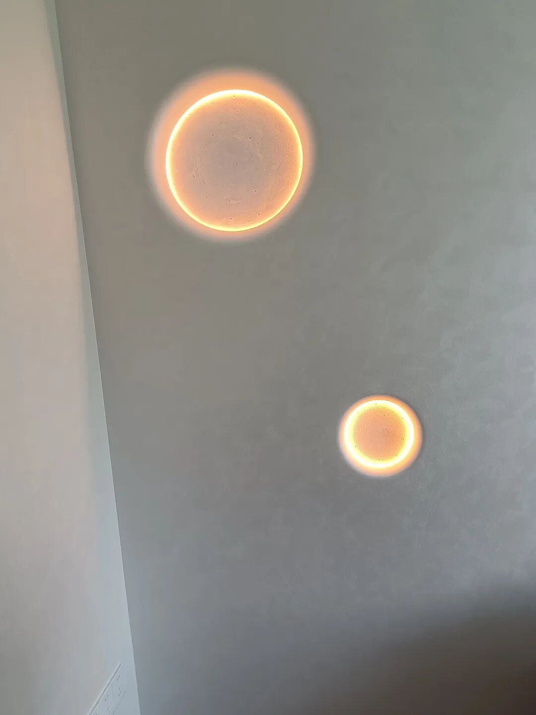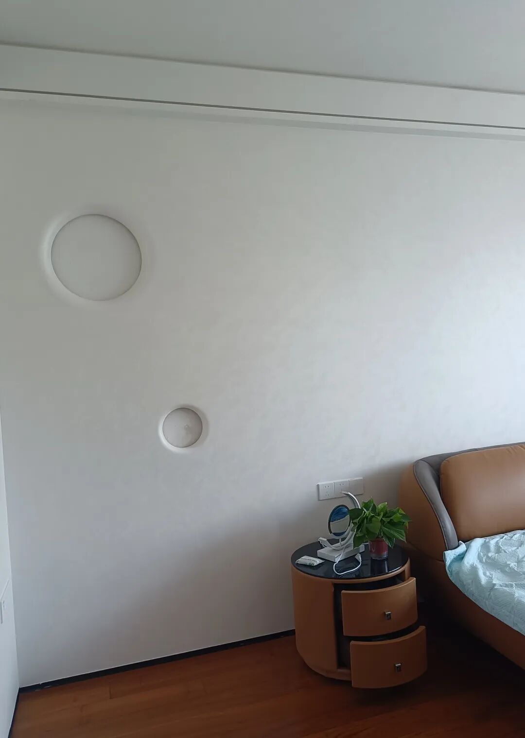 卧室是珍珠绒最温柔的舞台。床头背景墙的绒面肌理,在暖光下如同天鹅绒般亲肤,消解了都市的喧嚣,让人一踏入便卸下疲惫。就连墙面的圆形装饰,也因珍珠绒的包裹,褪去了冰冷的质感,化作空间里的温柔注脚,守护着每一夜的安睡。