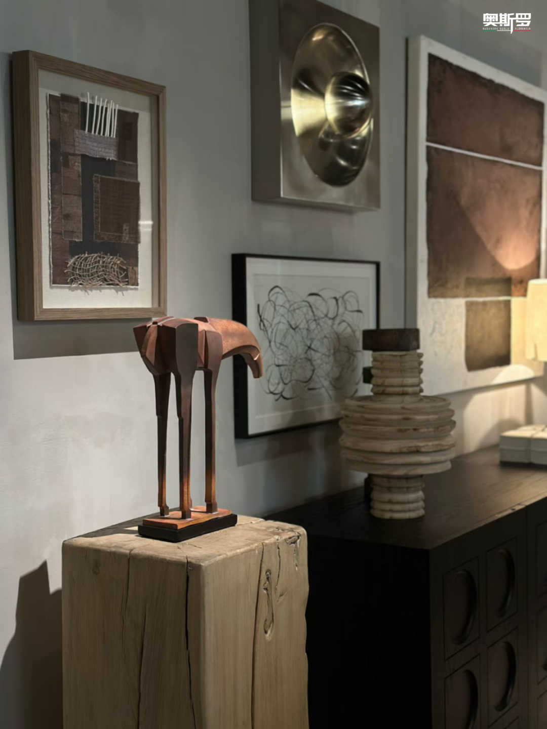 墙面的复古斑驳肌理与展厅内的木质家具、艺术画作、绿植摆件等完美契合、相得益彰。温润的木质家具衬得肌理更显沉稳,抽象画作与斑驳墙面形成视觉呼应,绿植的生机则中和了复古质感,让空间层次丰富,既具复古韵味,又充满自然松弛感,精准契合展厅“自然与艺术共生”的设计理念。