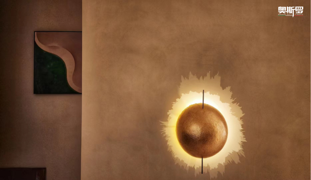 这个展厅,是一次关于材质与光影的实验,更是奥斯罗成都服务中心、中赛照明与玛泰TIXE系列三方美学的碰撞。奥斯罗成都服务中心通过玛泰艺术涂料,为中赛照明的灯具找到了最完美的“舞台”。在这里,光不再是冰冷的技术参数,而是有温度、有情感的艺术表达;墙面也不再是简单的背景,而是承载着设计美学与自然力量的主角。