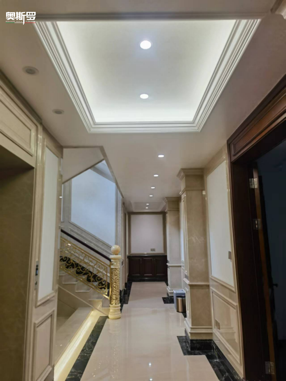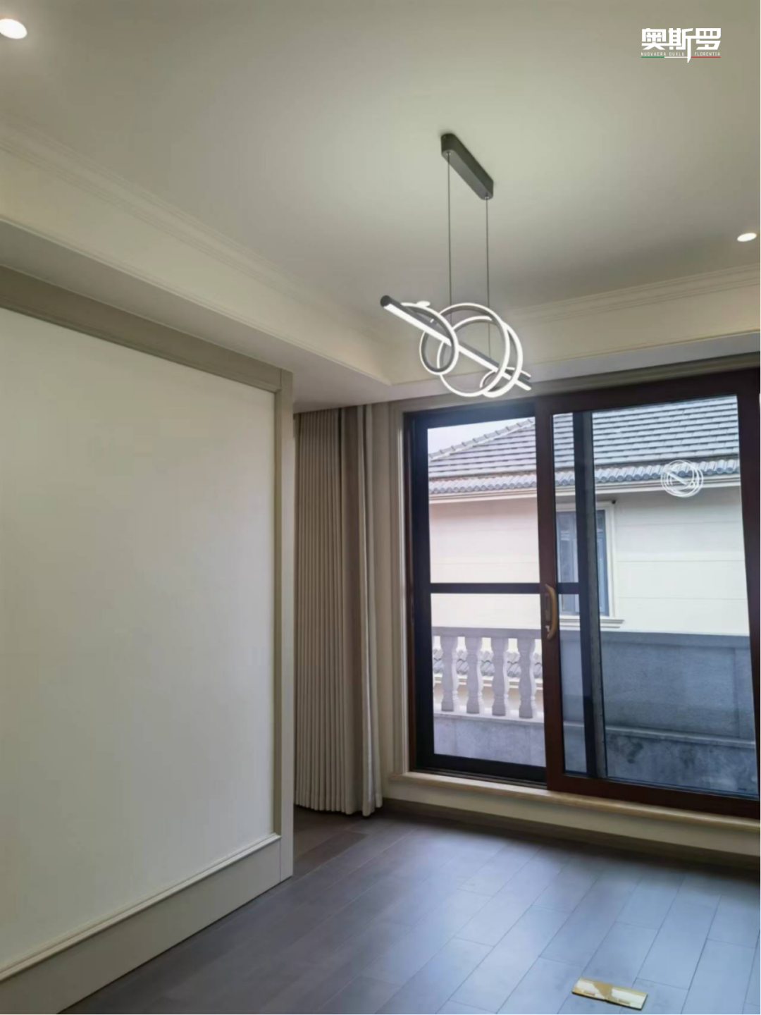 而奥斯罗的墙面与天花工艺,则用光影与质感,将这两种气质温柔串联 —— 美泰洛幻影的珠光让华贵更显通透,珍珠绒的柔润让沉稳更添温度,恒康蛋壳光三代的实用让日常更具质感。