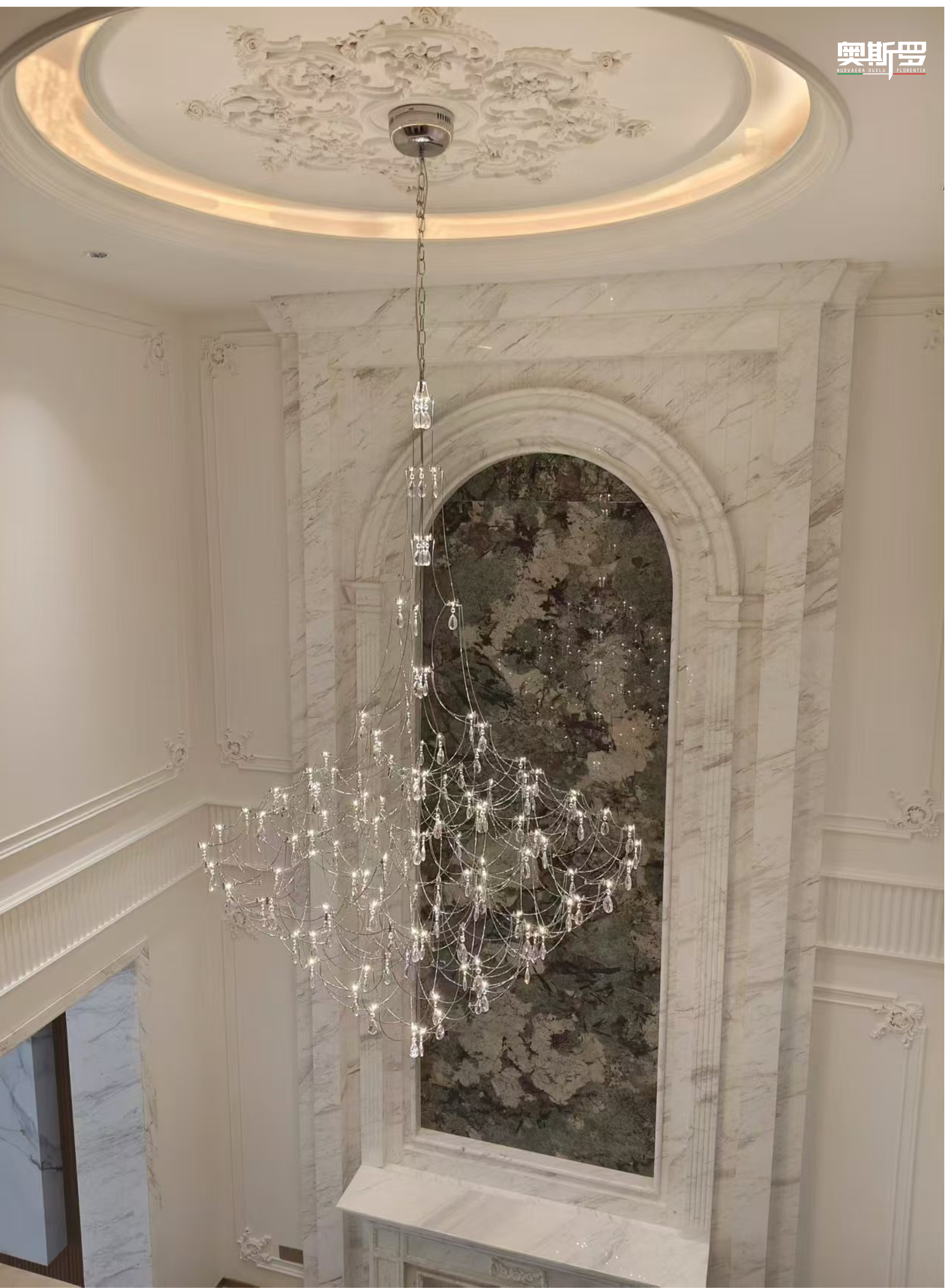 楼梯区域:通顶水晶灯垂落而下,美泰洛幻影天花将光线层层折射,与金色雕花栏杆、大理石台阶共同营造出纵深感,每一步都像行走在光影流动的艺术长廊。