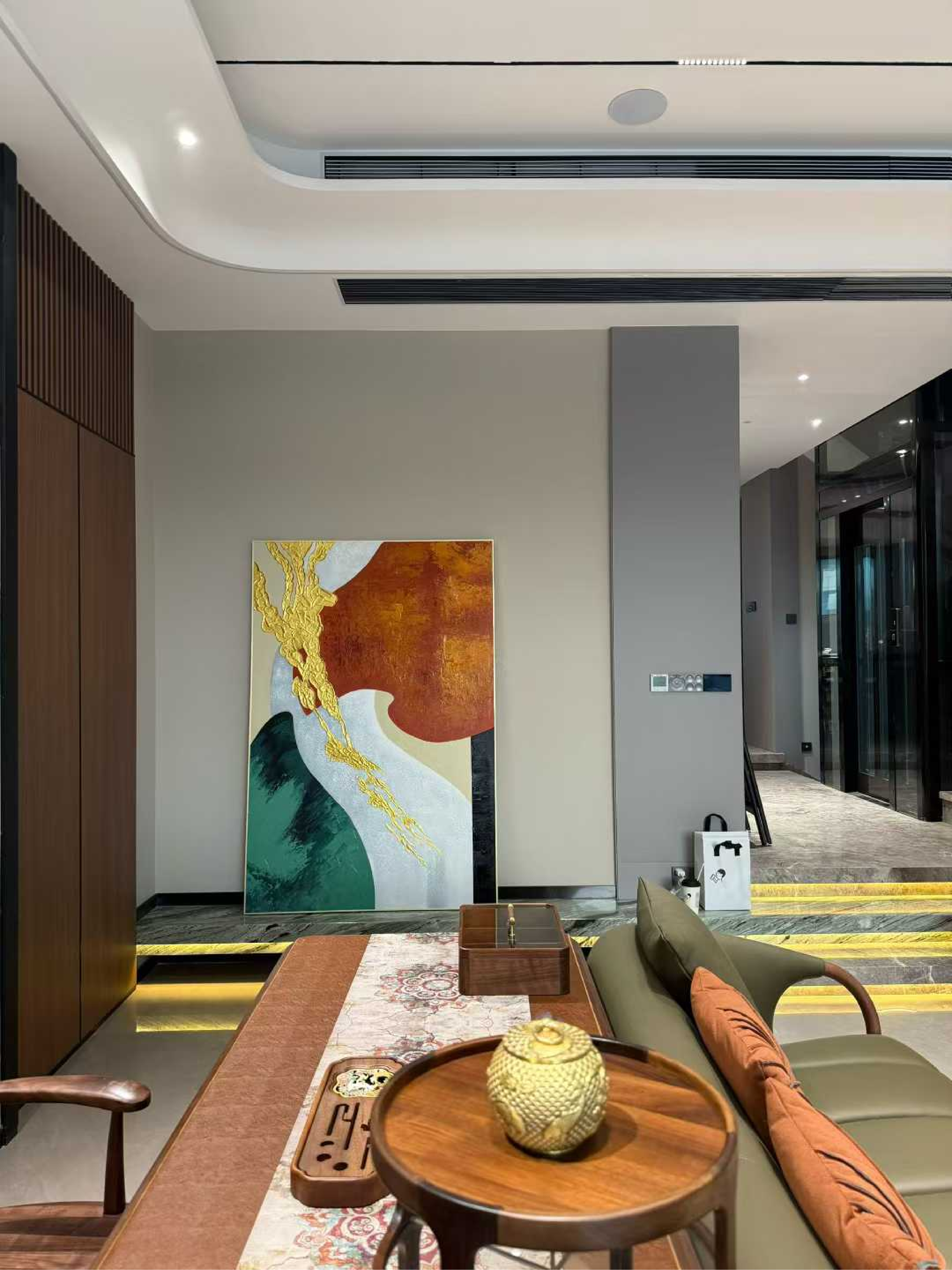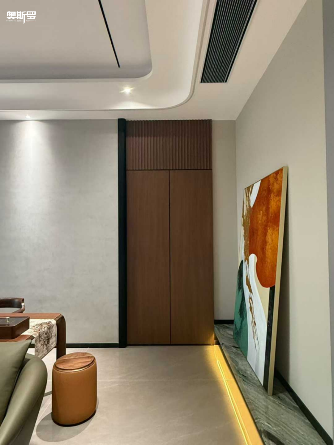 步入这套由奥斯罗广州五洲城服务中心打造的别墅,意式轻奢的高级质感扑面而来。空间以温润木色为基底,搭配低饱和的皮质软装,弧形吊顶与利落的线条交织,勾勒出简约而不简单的空间轮廓,而奥斯罗 OUXLU(贵族系列)涂料,正是这场空间美学叙事的核心笔触。
