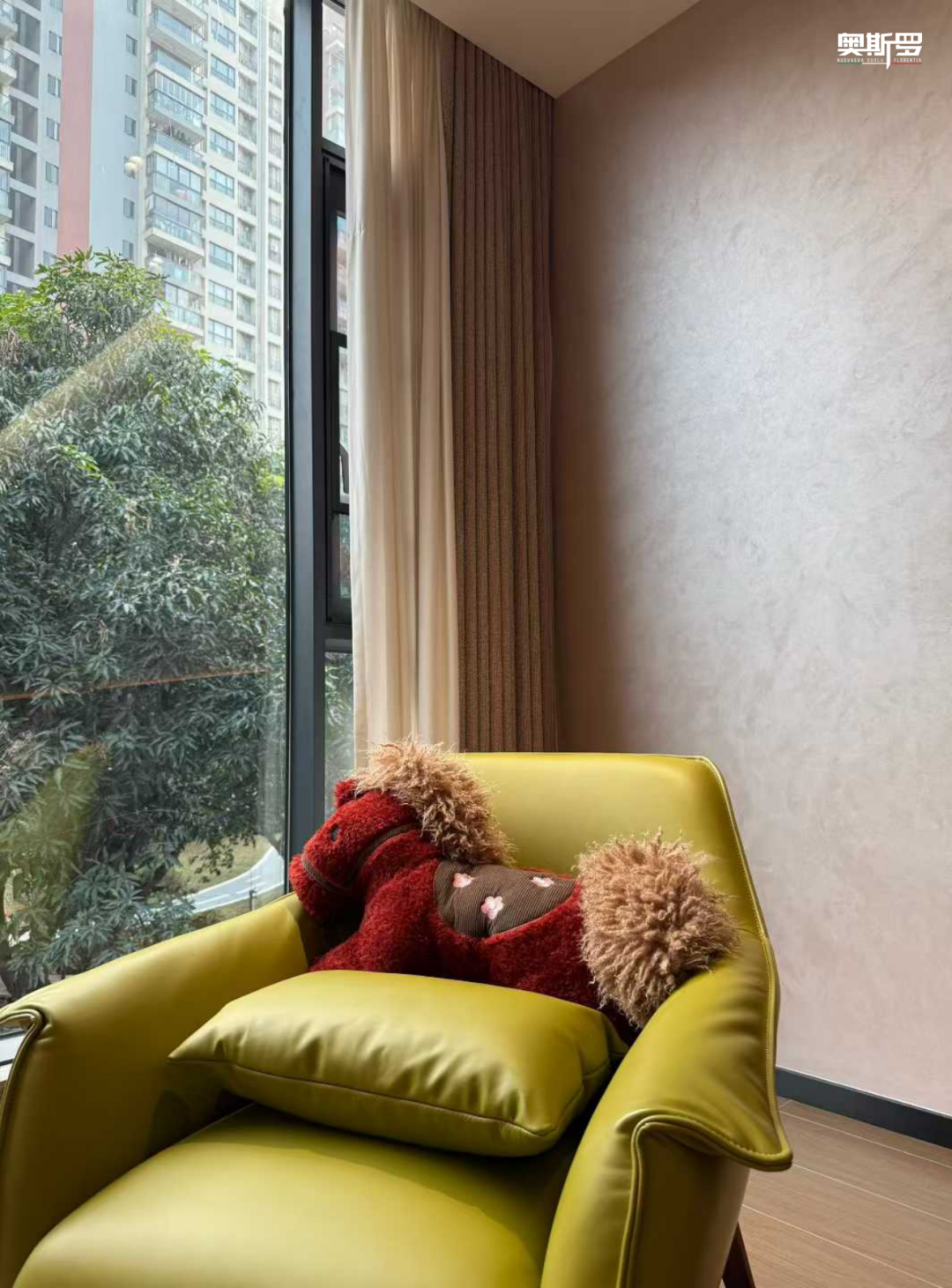 墙面则以珍珠绒艺术涂料揉花工艺打造,赋予空间独有的奢华肌理。珍珠绒自带的细腻珠光,在光影下流转出层次丰富的光泽,手工揉花工艺雕琢出自然灵动的纹理,近观是丝绒般的细腻触感,远观则是朦胧雅致的视觉效果,将低调奢华的氛围拉满。深浅交织的纹理与空间的软装细节呼应,木色家具的温润、皮质软装的质感,都在珍珠绒的映衬下更显立体,让每一面墙都成为空间的艺术注脚。