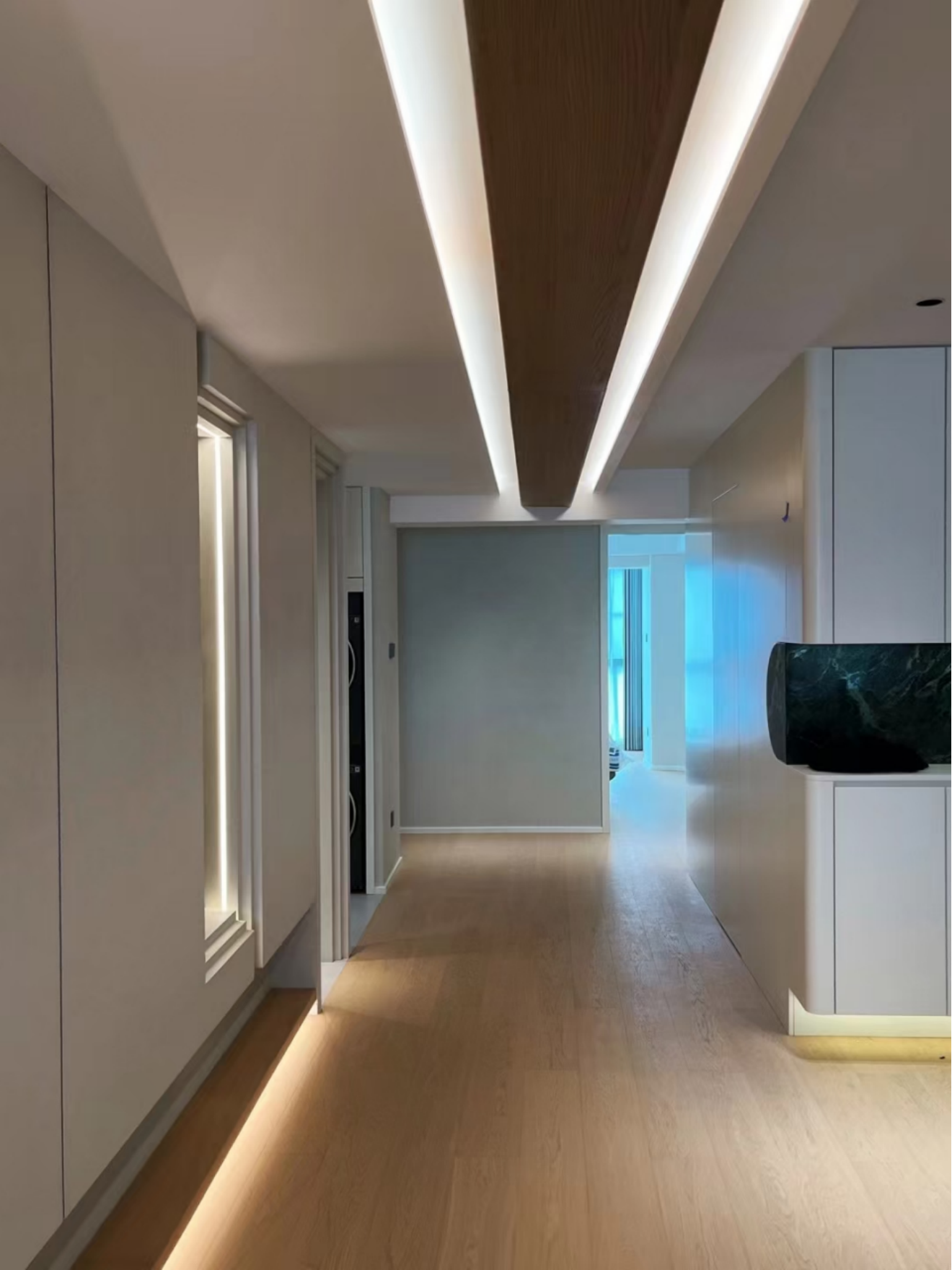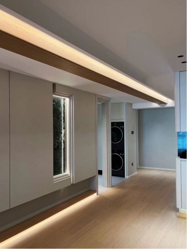 走廊与卫浴:狭长走廊的墙面被玛泰统一覆盖,天然石材的细腻肌理让狭长空间不显得压抑,配合顶部木质灯带的柔光,反而生出 “延伸感”;卫浴区的玛泰更将质感与实用完美融合 —— 在福州潮湿的气候里,其防潮防霉性能发挥得淋漓尽致,天然石材肌理的表层形成了一层致密的防护膜,能有效抵御水汽渗透,杜绝霉菌滋生,即便长期处于湿润环境,墙面也始终保持整洁干爽,同时与外部空间的肌理呼应,让动线更连贯。
