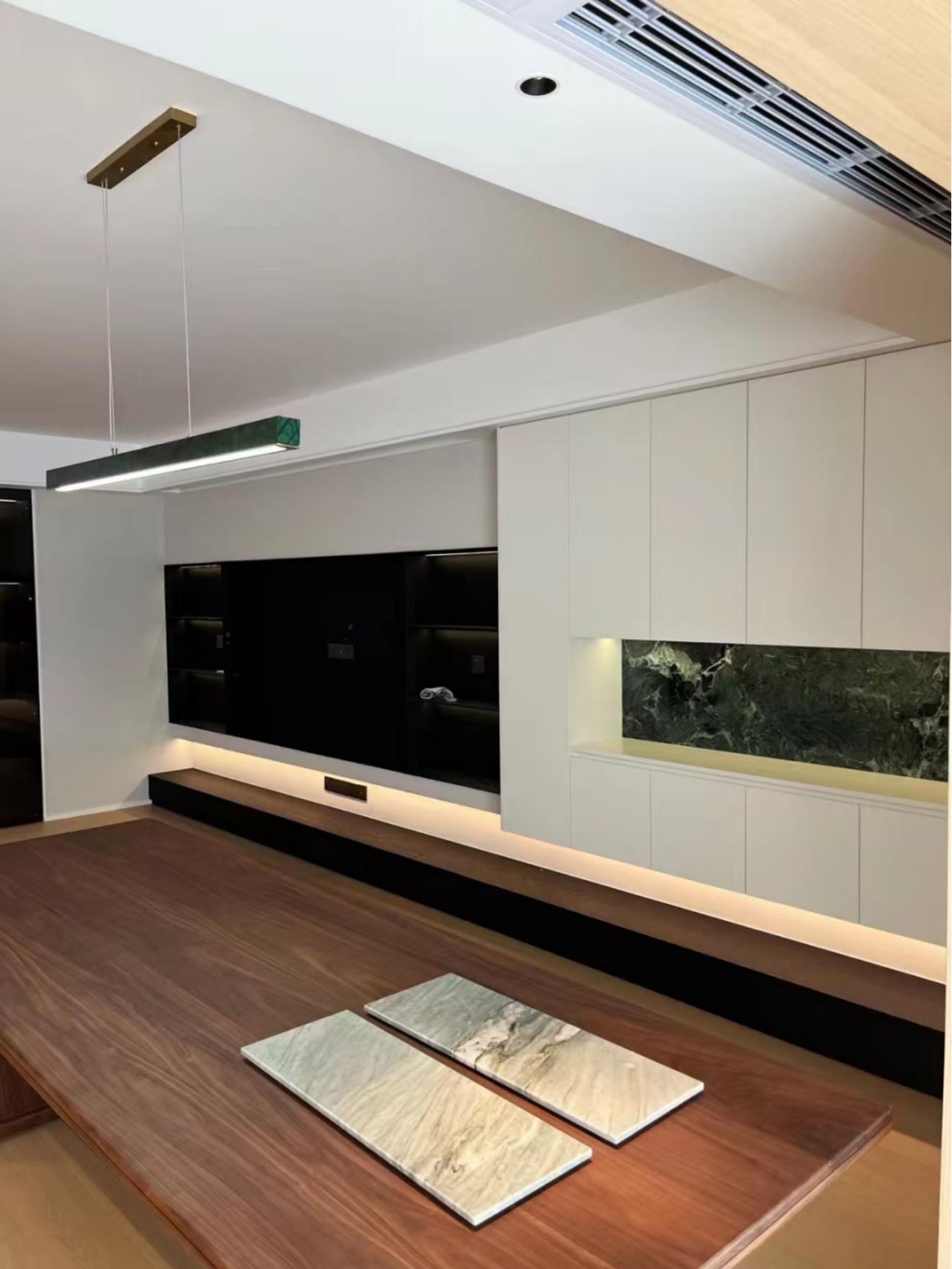 餐厨与公共区:餐厨区的玛泰墙面,以浅米色调复刻出天然洞石的温润质感,弱化了大理石台面的冷硬感。其哑光的石材肌理让线性地灯的光晕落在墙面上时,形成柔和的漫反射,既补足了空间光线,又不会像亮面墙那样产生刺眼反光;电视墙区域的玛泰,则以天然石材般的厚重质感承托住深色柜体的沉稳,让空间 “轻与重” 达成平衡,即便是多人聚餐时的磕碰,也不会轻易留下划痕,耐磨度媲美天然石材。