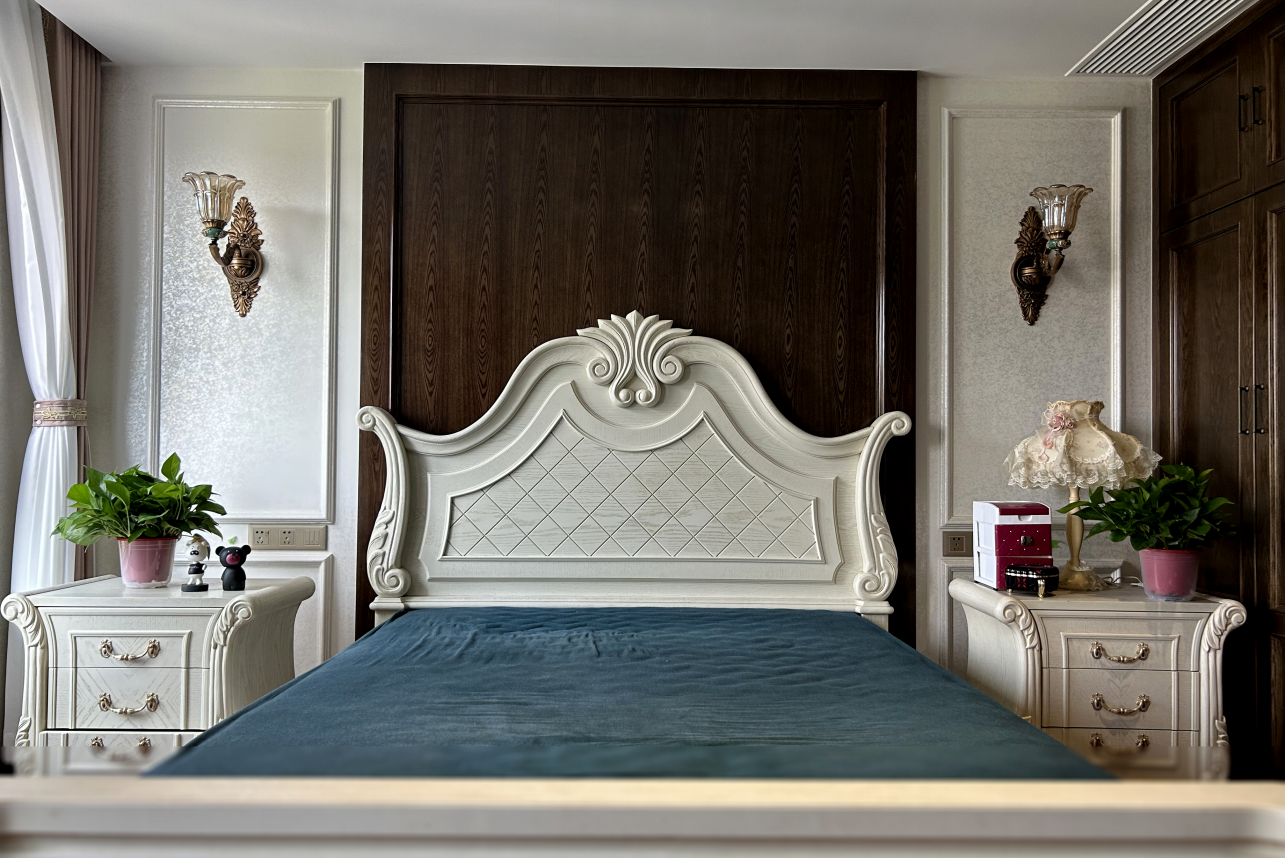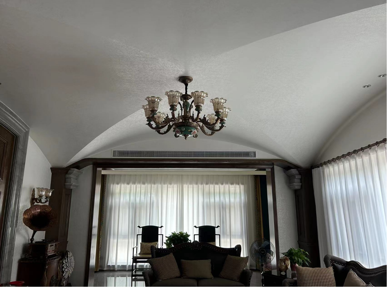 客厅拱形吊顶下的墙面,是美泰洛幻影 “千面性” 的绝佳舞台。复古吊灯的暖光缓缓铺展时,墙面肌理里的光泽会晕出淡淡的琥珀色,恰好和吊灯的绿釉装饰形成柔缓的色彩呼应;而当正午的自然光从窗边漫进来,肌理的光泽又会转成清透的浅米调,既托住了欧式拱顶的柔婉线条,又能和中式实木家具的深棕纹理达成平衡 —— 既不会因过于跳脱抢了家具的厚重质感,又能用光影的轻,中和空间里硬质装饰的沉,让中西混搭的风格更显融洽。