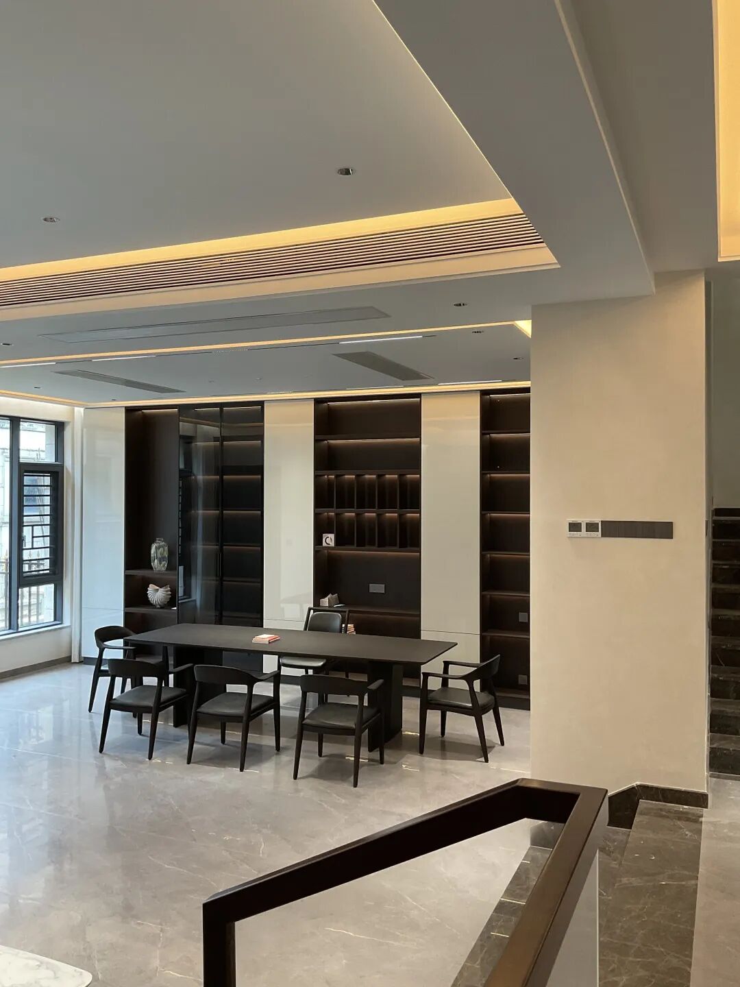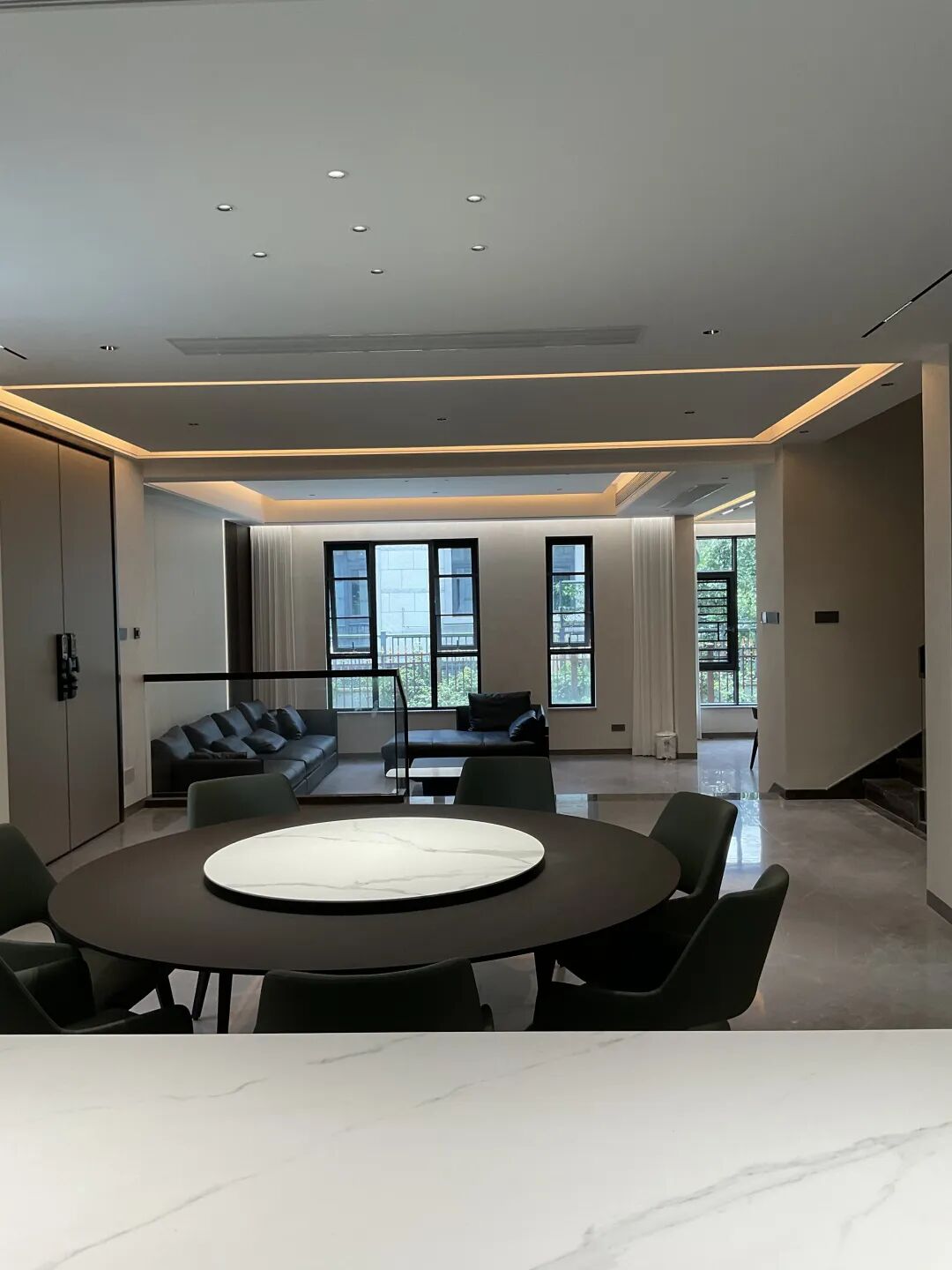 在暖黄线性灯带的漫射光影下,珍珠绒的肌理尽显精妙 —— 肉眼难辨的细腻颗粒均匀分布,随着视线的流转,墙面会漾开一层若有若无的珠光质感,似晨雾轻笼湖面,又似星河碎落人间。这份微光不张扬、不刺眼,却让空间的层次感瞬间拉满:开阔的客厅里,光影在墙面缓缓游走,与黑色皮质沙发的沉稳、大理石圆桌的温润相映成趣;通透的餐厅区域,圆形餐台的雅致与墙面的珠光质感相融,用餐的时刻便多了几分温馨与仪式感;连连接空间的楼梯区域,珍珠绒的细腻肌理包裹着深色大理石台阶,玻璃护栏的通透与墙面的柔光交织,上下之间,皆是从容与雅致。