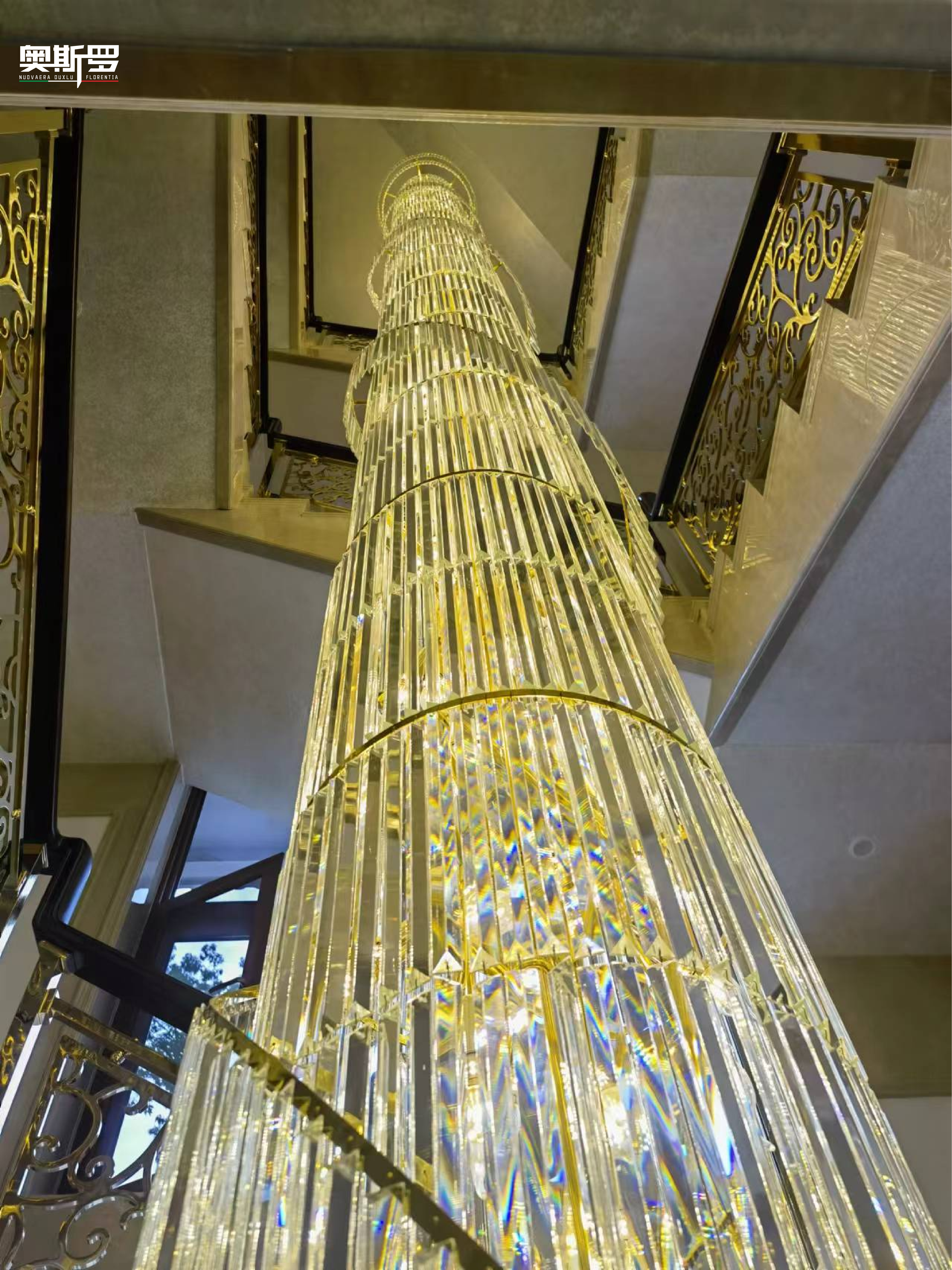 楼梯区域:通顶水晶灯垂落而下,美泰洛幻影天花将光线层层折射,与金色雕花栏杆、大理石台阶共同营造出纵深感,每一步都像行走在光影流动的艺术长廊。