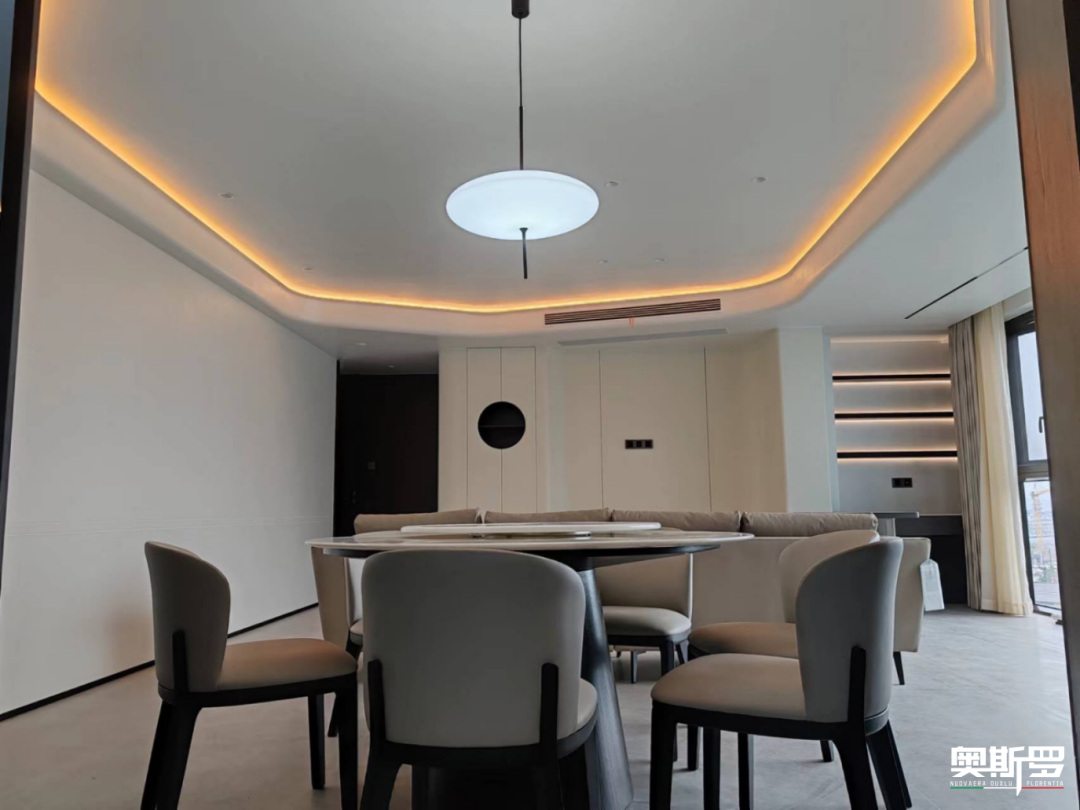 它用细腻肌理替代了花哨的纹样,用金属光泽平衡了空间的素净,让客厅的开阔、餐厅的温馨、卧室的静谧都有了统一的美学基调。无论是午后阳光斜照时,墙面泛起的细碎光斑,还是夜晚暖灯亮起时,肌理间流淌的温柔光晕,都在诉说着奥斯罗对 “家” 的理解:好的装饰,从来不是为了炫耀,而是为了让居住者在每一次触摸、每一次凝望中,都能感受到工艺的温度与生活的诗意。