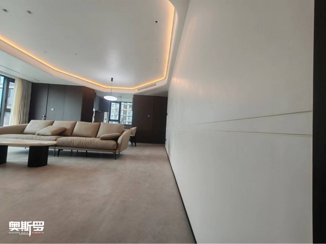 步入客厅,目光最先被墙面的肌理吸引 —— 奥斯罗 OUXLU( 贵族系列)威尼斯灰泥以手工擦抹的方式,在素净底色上晕染出若隐若现的金属质感。没有刺眼的锋芒,只有光线流转时,墙面泛起的温润银辉,像被时光打磨过的旧银器,在暖光灯带的映衬下,与浅米色沙发、深胡桃木柜体形成层次分明的视觉对话。